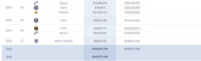 換言之從湖人離開后威少實(shí)際上賺到的薪水只有78萬+383萬+562萬+360萬(不保障),合計(jì)只有1383萬,這里面還有360萬不知道能不能全額拿到,威少從一個(gè)年薪4000+萬的超巨淪為聯(lián)盟的邊角料。