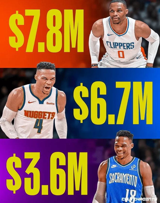 大家可以看看威少離開湖人后他的薪水下滑有多么嚴(yán)重!22-23賽季他被湖人交易到爵士后遭到裁員,隨后威少以一年78萬的合同加盟快船,在快船打了半個(gè)賽季后2023年夏與快船簽下兩年780萬。